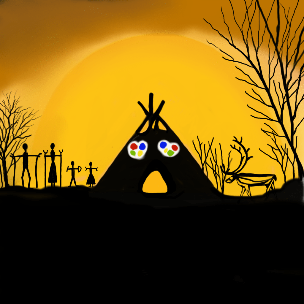 När jag var liten och var hos mormor och morfar berättade mormor om en kvinna som föddes på 1600 talet och blev nåjd en kvinnlig nåjd som slog på trumman!Hon berättade också att nere vid båt länningen finns en sten som är Rika Majas och den ser ut som rika-majas mössa så där under är det en skatt nedgrävd av henne(troligen ville dom bli av med oss en stund så där grävde många barn)!Jag har målat många motiv med samisk inspiration genom åren,men kände det var dax att göra spå trummor så här är den första!mvh Marina